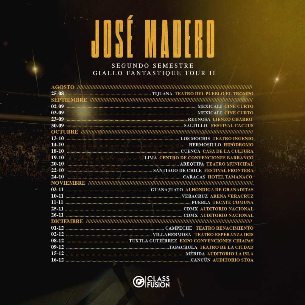 Volviendo al Auditorio Nacional, los shows de Ciao Giallo están programados para los días 25 y 26 de noviembre. Como primer acto de ambas fechas, podremos disfrutar de principio a fin del disco Giallo y para el segundo acto, Madero hará un recorrido por toda su discografía, interpretando diferentes canciones en ambos shows para así ofrecer dos noches totalmente diferentes entre sí. En lo que sí coincidirán sus presentaciones es que, en cada una de ellas el músico deleitará a su público con aproximadamente 40 temas, dando como resultado conciertos de cerca de 3 horas de duración, situación que no es nueva para sus seguidores, pues para el músico resulta sumamente importante respetar el tiempo y economía de sus fans.