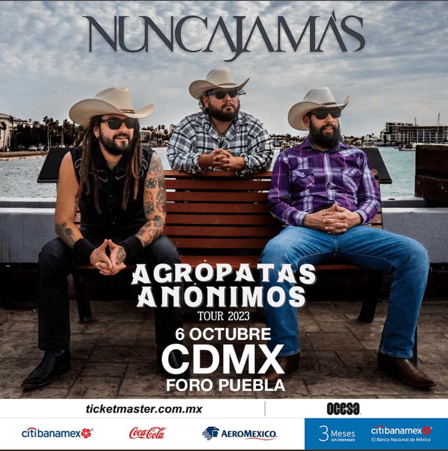 El 6 de octubre arrancan los conciertos que los sonorenses de Nunca Jamás tienen programados durante el mes. Agrópatas Anónimos es el nombre del tour con el que este año los venidos del desierto continúan la actividad de esta serie de shows que inician en CDMX para posteriormente volar a Mexicali, hacer ruta por Estados Unidos, donde pisarán escenarios en Denver, Salt Lake City, Las vegas y Los Ángeles, y luego volver a tierras mexicanas para concluir el 20, 21 y 22 en Guanajuato, Morelia y Querétaro respectivamente, agenda que nos permite apreciar que la banda está atravesando por uno de los mejores momentos de la banda con música nueva y fechas constantes.