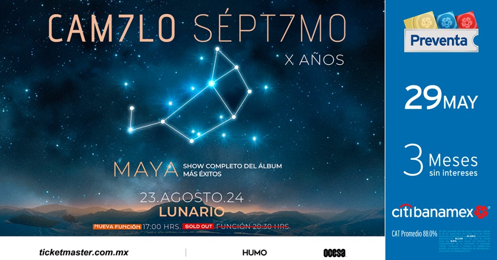 Este 23 de agosto, Camilo Séptimo volverá al Lunario del Auditorio Nacional para tocar en su totalidad el Ep Maya, disco con el que los conocimos y que nos hizo enamorarnos de su música gracias a canciones como “No confíes en mí” o “Te veo en el 27”. La presentación será doble, ya que después de agotar rápidamente la función original, la banda agregó un show más a las 17:00 hrs.