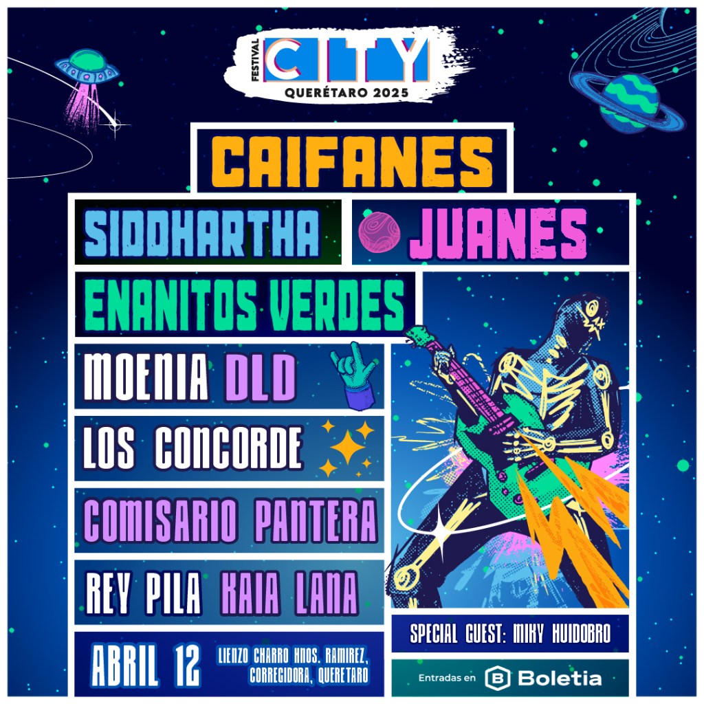 Este año, Festival City vuelve a apostar por la diversidad y también por la nostalgia pues, en lo que promete ser una jornada llena de energía y música, podremos disfrutar con las presentaciones de Moenia, DLD, Los Concorde, Comisario Pantera, Rey Pila, Kaia Lana y, encabezando el cartel, Enanitos Verdes, Juanes, Siddhartha y ¡Caifanes!, dando como resultado una alineación ideal para un público multigeneracional.