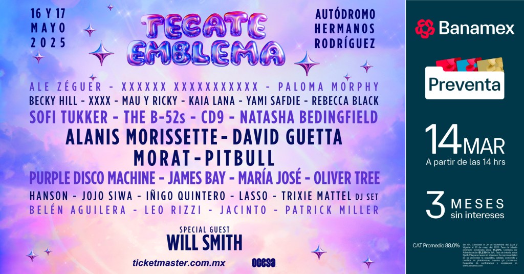 Además del talento musical, esta edición de Tecate Emblema contará con ¡Will Smith como invitado especial! Y como en todo gran festival, habrá zonas de descanso, diferentes actividades interactivas, una amplia variedad de food trucks para saciar los antojos y paladares más exigentes y cerveza bien fría. Así que armen plan con sus amigos, preparen su mejor outfit y aseguren sus accesos lo antes posible para disfrutar un fin de semana lleno de música en el mejor ambiente.