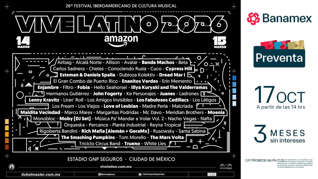 Si quieres ser parte del encuentro donde todos nos volvemos una sola voz, sentir la música en la piel y unirte a la celebración donde se escribe la historia musical de México y Latinoamérica, podrás asegurar tus boletos este 17 de octubre en la Preventa Banamex o en venta general a partir del 18 de octubre.