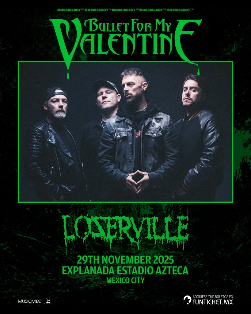 Directo de Gales y con más de 20 años de trayectoria, Bullet For My Valentine se ha consolidado como uno de los actos más enérgicos y potentes del rock contemporáneo gracias a sus riffs furiosos, solos desgarradores y los coros de su metalcore melódico que ha definido a toda una generación. Su visita a México se da como parte de la gira de aniversario de su álbum debut: The Poison, el cual sonará de inicio a fin este 29 de noviembre.