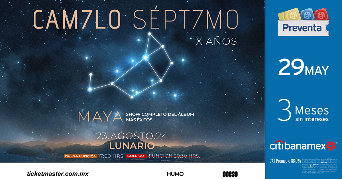 Este 23 de agosto, Camilo Sรฉptimo volverรก al Lunario del Auditorio Nacional para tocar en su totalidad el Ep Maya, disco con el que los conocimos y que nos hizo enamorarnos de su mรบsica gracias a canciones como โNo confรญes en mรญโ o โTe veo en el 27โ. La presentaciรณn serรก doble, ya que despuรฉs de agotar rรกpidamente la funciรณn original, la banda agregรณ un show mรกs a las 17:00 hrs.