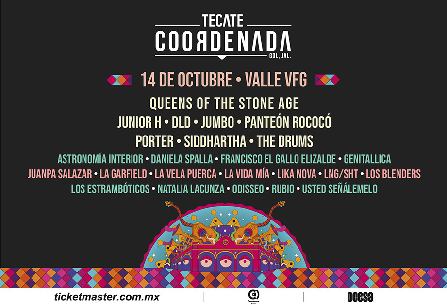 Tecate Coordenada 2022. Algunos de los nombres que conforman el cartel de Tecate Coordenada 2023 son: Genitallica, Los Blenders, Daniela Spalla, La Vela Puerca, Astronomรญa Interior, Siddhartha, Panteรณn Rococรณ, The Drums y el regreso a nuestro paรญs de ยกQueens Of The Stone Age!, Ademรกs, este aรฑo el festival se diversifica agregando sonidos nuevos como Junior H o los colombianos Lika Nova, entre muchos mรกs que nos harรกn disfrutar de nueva cuenta en el Valle VFG.